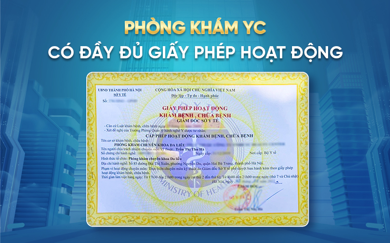 Phòng khám YC Việt Nam đã được Sở y tế Hà Nội cấp phép hoạt động chữa bệnh, chữa bệnh trong lĩnh vực da liễu và thẩm mỹ. Để được phép làm giấy hoạt động, phòng khám YC Việt Nam phải trải nghiệm kiểm tra định mức các tiêu chí ngâm từ Bộ Y tế và luôn khẳng định lực lượng thế là một phòng khám uy tín hàng đầu trong lĩnh vực điều trị da mộc.
